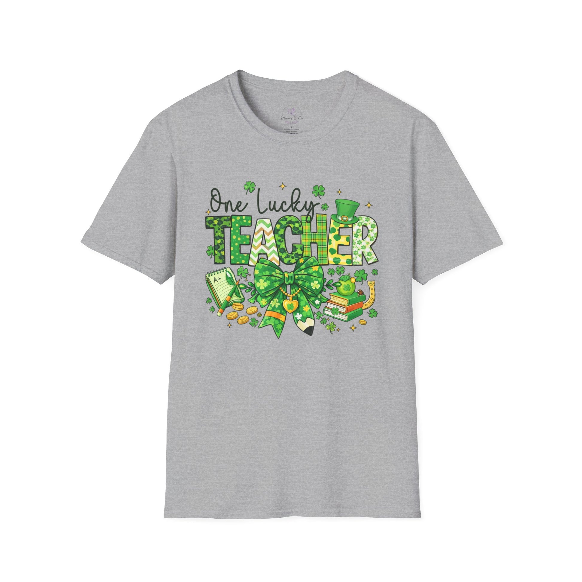 This lightweight cotton tee brings playful St. Patrick’s Day cheer to the classroom. A lively, green-hued design reads “One Lucky Teacher” surrounded by shamrocks, coins, a top hat, and a stack of books—small details that celebrate both luck and learning. Breathable ring-spun cotton and a clean crew neckline keep the shirt comfortable for long school days, while the tear-away label and stable shoulder tape make it feel thoughtfully made. Wear it on casual school days, holiday parties, or while prepping lessons to spark smiles from students and colleagues alike.