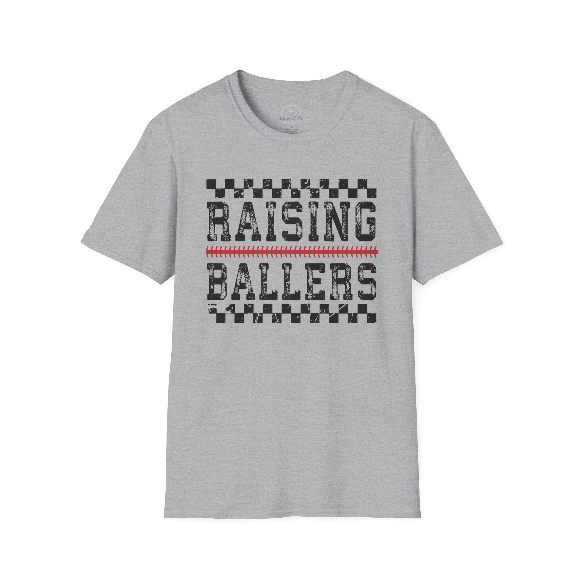 This soft, breathable tee carries a bold, vintage-inspired racing motif — chequered bands framing distressed block letters that read “RAISING BALLERS.” Lightweight Airlume combed cotton gives it an easy drape, while the retail crew neckline and side seams keep the shape neat through everyday wear. It feels like the shirt a parent or coach reaches for when they’re cheering from the sidelines: confident, comfortable, and built to move with busy days and loud celebrations. Wear it to practices, weekend errands, or post-game hangouts to show quiet pride in the young athletes you support.