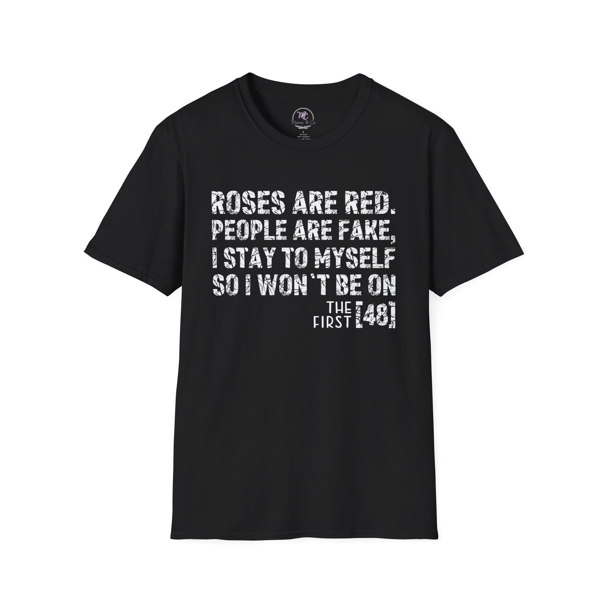 A lived-in, low-key tee for people who prefer quiet over crowds. The soft, lightweight cotton drapes easily and lets the distressed white statement stand out on deep black. Wear it on days you want to keep distance with a dash of dry humor — it reads like a short, honest note: Roses are red, people are fake, I stay to myself so I won’t be on the first 48. The crew neck and classic fit keep the silhouette familiar and wearable all year; shoulder tape and a ribbed collar help it hold shape after washes. Comfortable enough to lounge in, crisp enough to layer under a jacket for a night out that doesn’t demand small talk.
